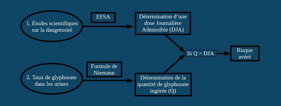 La Dose Journalière Admissible (DJA) est une estimation de la quantité d’une substance contenue dans un aliment ou une boisson qui peut être consommée quotidiennement tout au long de la vie sans présenter de risque appréciable pour la santé. Pour évaluer le risque dû à l’ingestion de glyphosate, les agences de sécurité comparent la dose quotidienne de glyphosate ingérée à la DJA. Se basant sur des données publiées concernant les taux de glyphosate urinaire mesurés en fonction des quantités ingérées connues, nos objectifs étaient de tester la robustesse du modèle mathématique actuellement utilisé pour calculer la dose journalière de glyphosate ingérée, et de proposer des modèles alternatifs basés sur la cinétique d’excrétion urinaire. Nos résultats montrent que la quantité de glyphosate ingérée est systématiquement sous-estimée par le modèle actuellement utilisé par les agences de sécurité, alors que les autres modèles évalués montrent de meilleures estimations, avec des différences selon le sexe. Nos résultats montrent également une grande variabilité entre les individus, conduisant à certaines incertitudes notamment en ce qui concerne la DJA, et confirment également que l’excrétion du glyphosate varie de manière significative entre les individus qui suivent un schéma posologique similaire. En conclusion, notre étude souligne le manque de fiabilité des processus d’évaluation menés par les agences de sécurité pour le glyphosate en particulier, et les pesticides en général, et s’interroge sur la pertinence de tels processus censés sauvegarder la santé humaine et l’environnement.